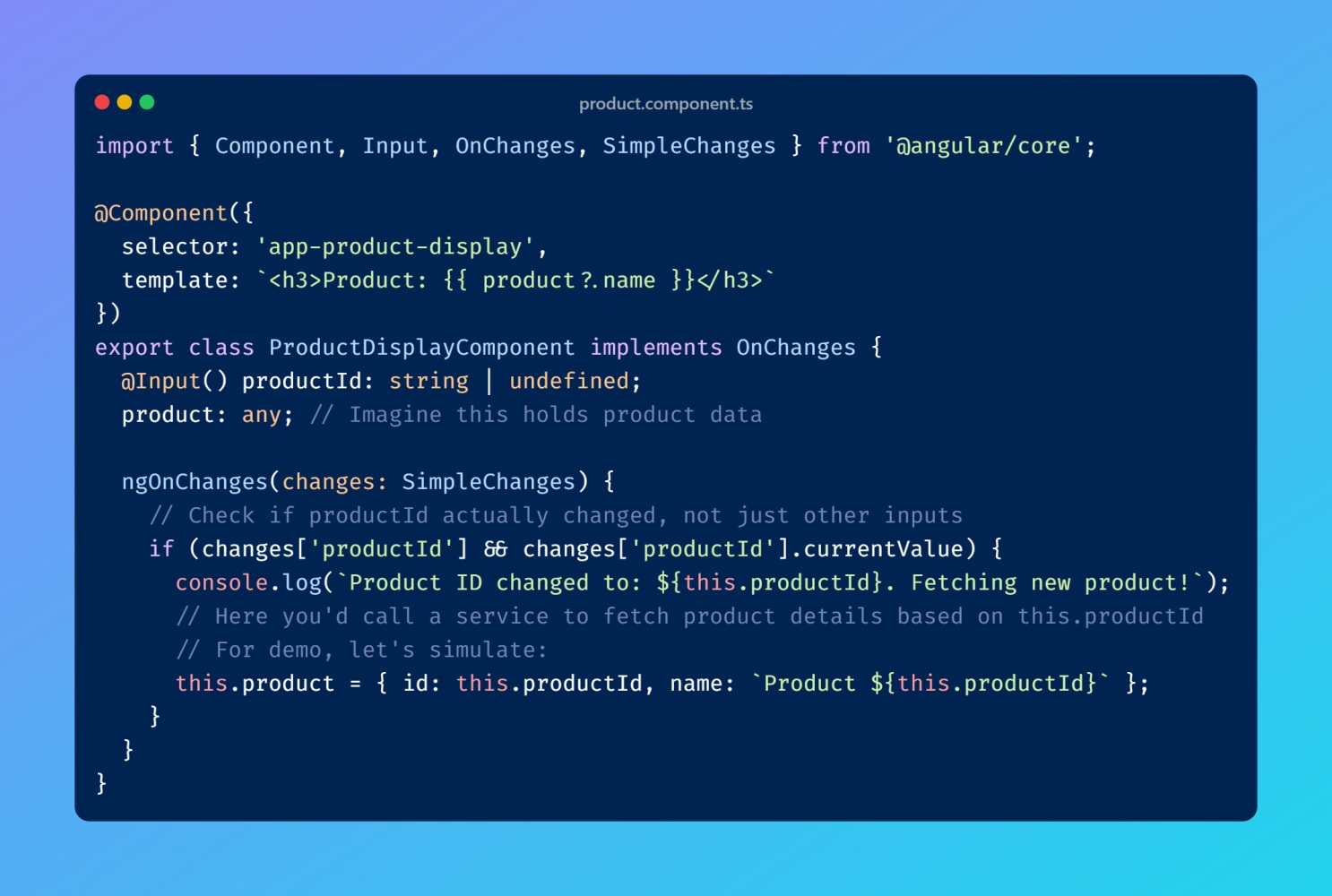 ngOnChanges() is your component's way of saying: "Hey, my parent component just updated one of my inputs!" It fires every time a property decorated with @Input() changes.