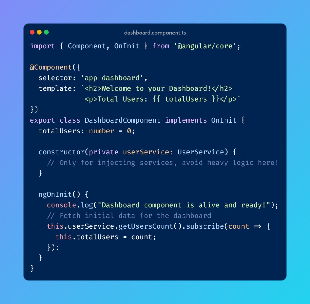 ngOnInit()for Angular-specific initialization. The constructor should primarily be for dependency injection.